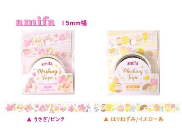 【amifaマステ】アミファマスキングテープ フラワー&アニマル柄 NO.60249【ご選択:うさぎ/ピンク、はりねずみ/イエロー系】